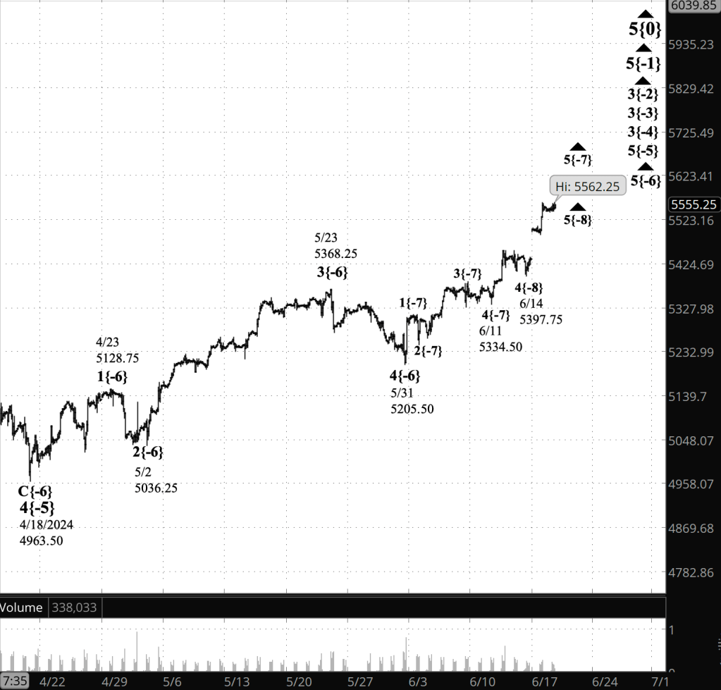 - Wave 5{-6} is underway and is in its final subwave, uptrending wave 5{-7}.