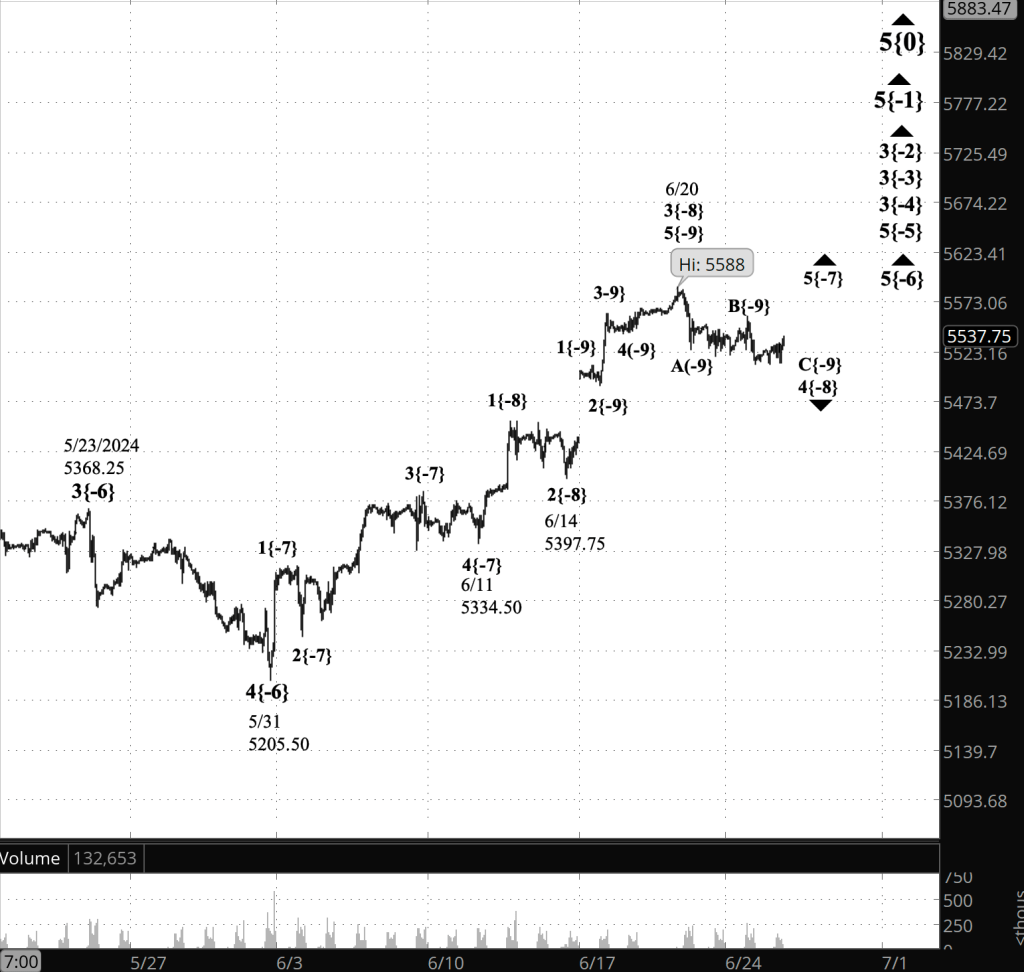 What are the alternatives? Also unchanged. There may be a 1st wave on the chart, between wave 5{-6} and 5{-5}. If that’s the proper count, then it would delay the onset or the 4th-wave downward correction, wave 4{-4}. See the June 18 Trader’s Notebook for a more detailed discussion.