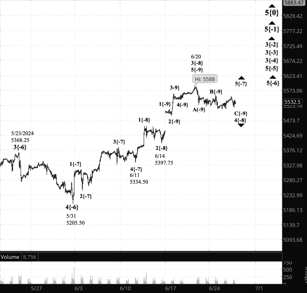 What are the alternatives? There may be a 1st wave on the chart, between wave 5{-6} and 5{-5}. If that’s the proper count, then it would delay the onset or the 4th-wave downward correction, wave 4{-4}. See the June 18 Trader’s Notebook for a more detailed discussion.