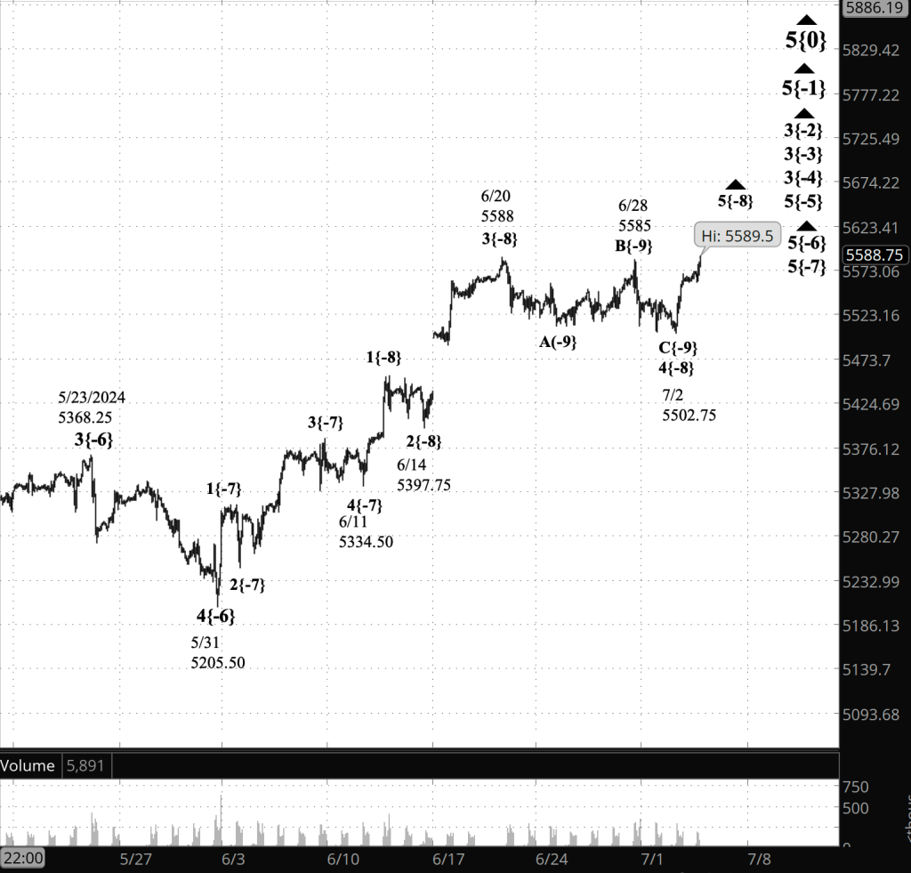 If the price breaks above the June 28 high, 5585, that will strengthen the case that wave C has ended and the following 5th-wave uptrend has begun. A break below the July 2 low, 5502.75, will strengthen the case that wave C is still underway.