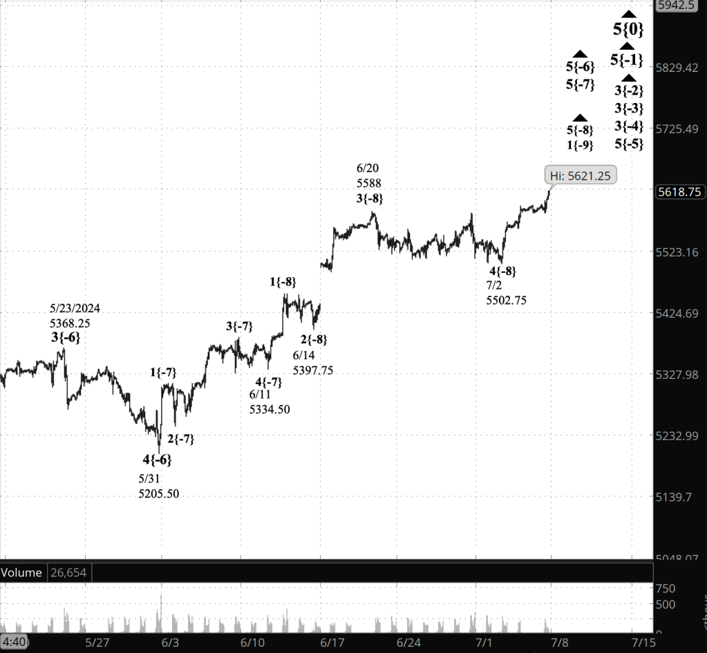 Half an hour before the closing bell. The S&P 500 futures rose during the session, reaching above the overnight high to 5621.25. Elliott Wave Analysis: The rise is a 5th-wave uptrend that began on July 2. the wave has traveled to the upside with sufficient clarity that I’m removing the alternative analysis that saw a possibility that the rise was a subwave of the preceding 4th-wave downward correction.