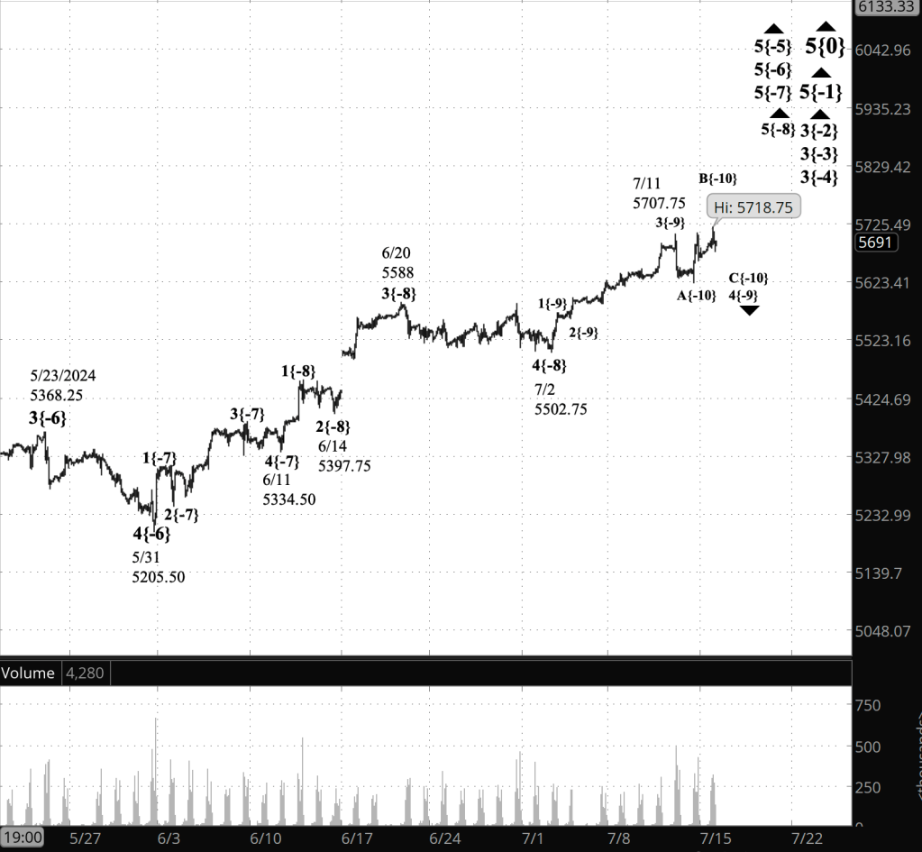 Half an hour before the closing bell. The S&P 500 futures has risen above the overnight high during the session, into the 5710s. Elliott Wave Theory: Within the 4th-wave downward correction that began on July 11, I’ve moved the end point of the rising B wave — the middle subwave — to the session high, and consider the falling C wave — the final subwave — to have begun from that point. Otherwise, the morning analysis is unchanged.