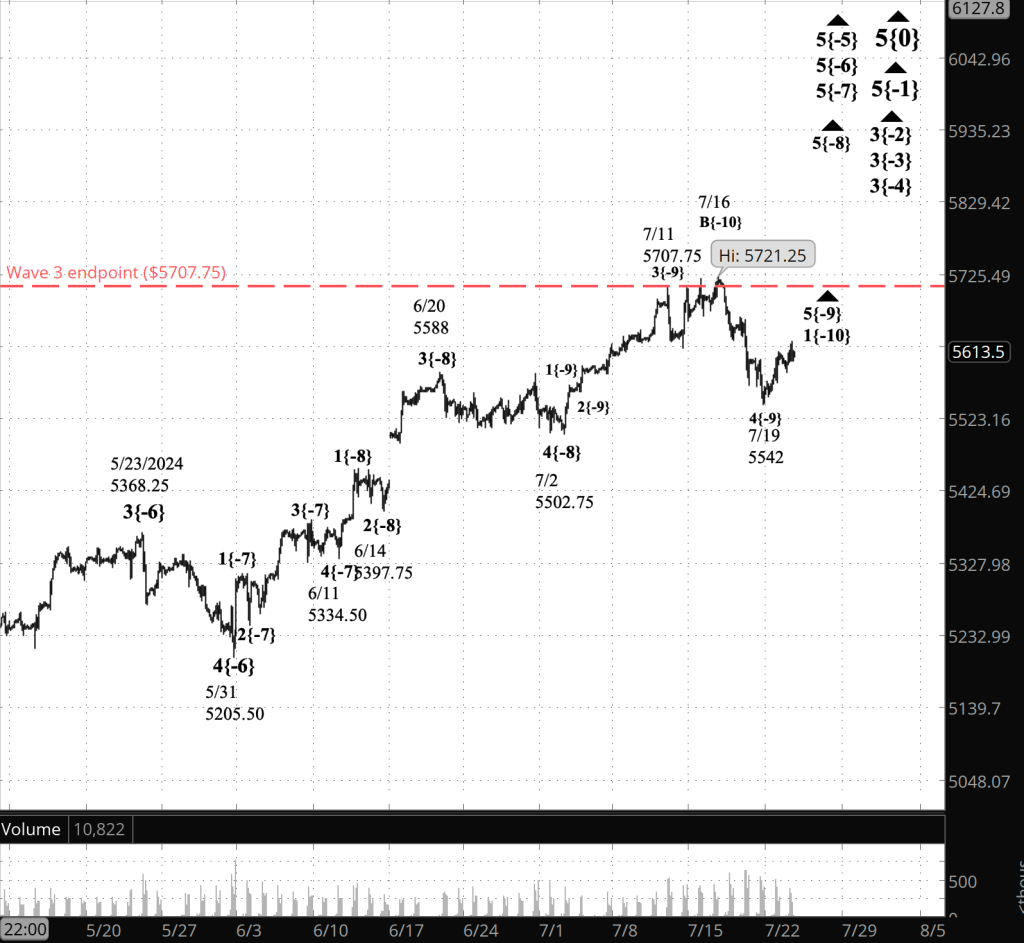 The next milestone ahead for wave 5 is to exceed the price where the prior 3rd wave ended, 5707.75. I’ve marked that level on the chart with a dashed line. Typically, a 5th wave will move beyond the 3rd wave’s endpoint, although not always. A rise above that level suggests that this wave 5 isn’t truncated. Whether it will be extended is still an open question.