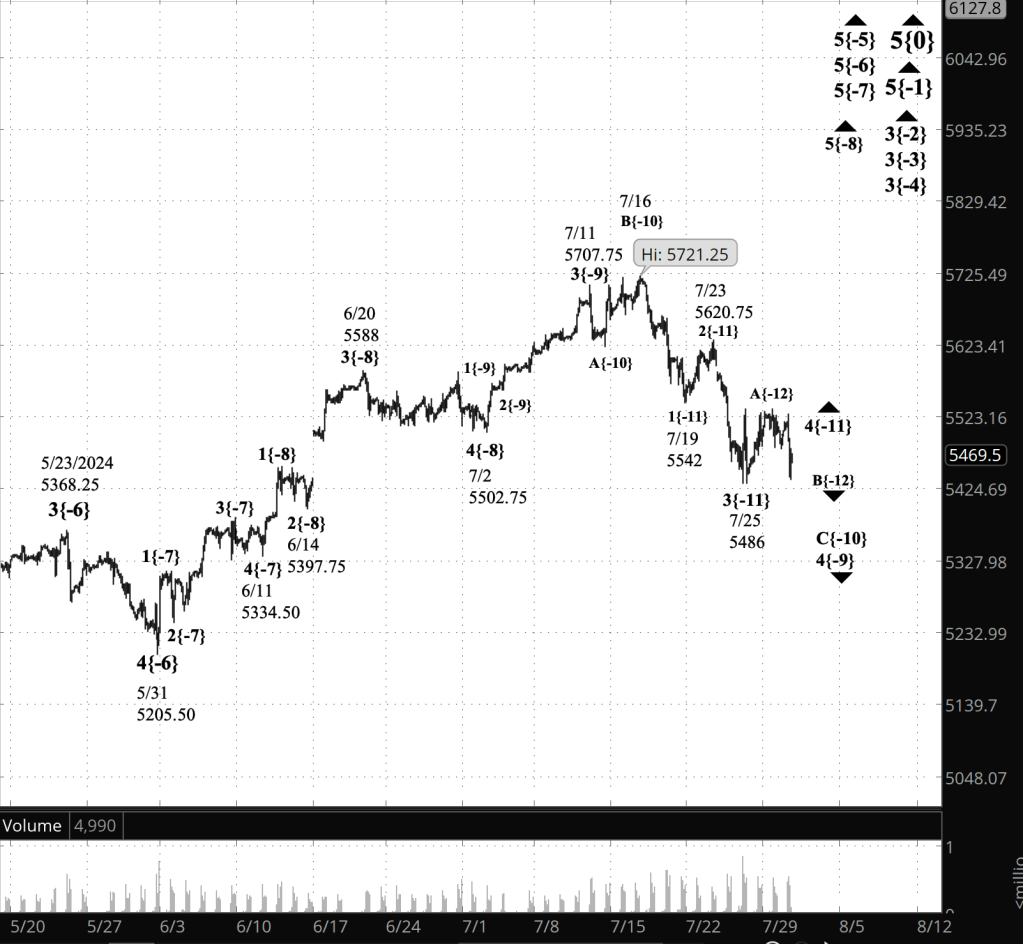 Half an hour before the closing bell. The S&P 500 futures fell during the session, so far reaching into the 5430s. Elliott Wave Theory: A 4th-wave upward correction, which began on July 25, within a larger 4th-wave downward correction, which began on July 11, is in its final subwave, rising wave C, which in turn is in its middle subwave, declining wave B.