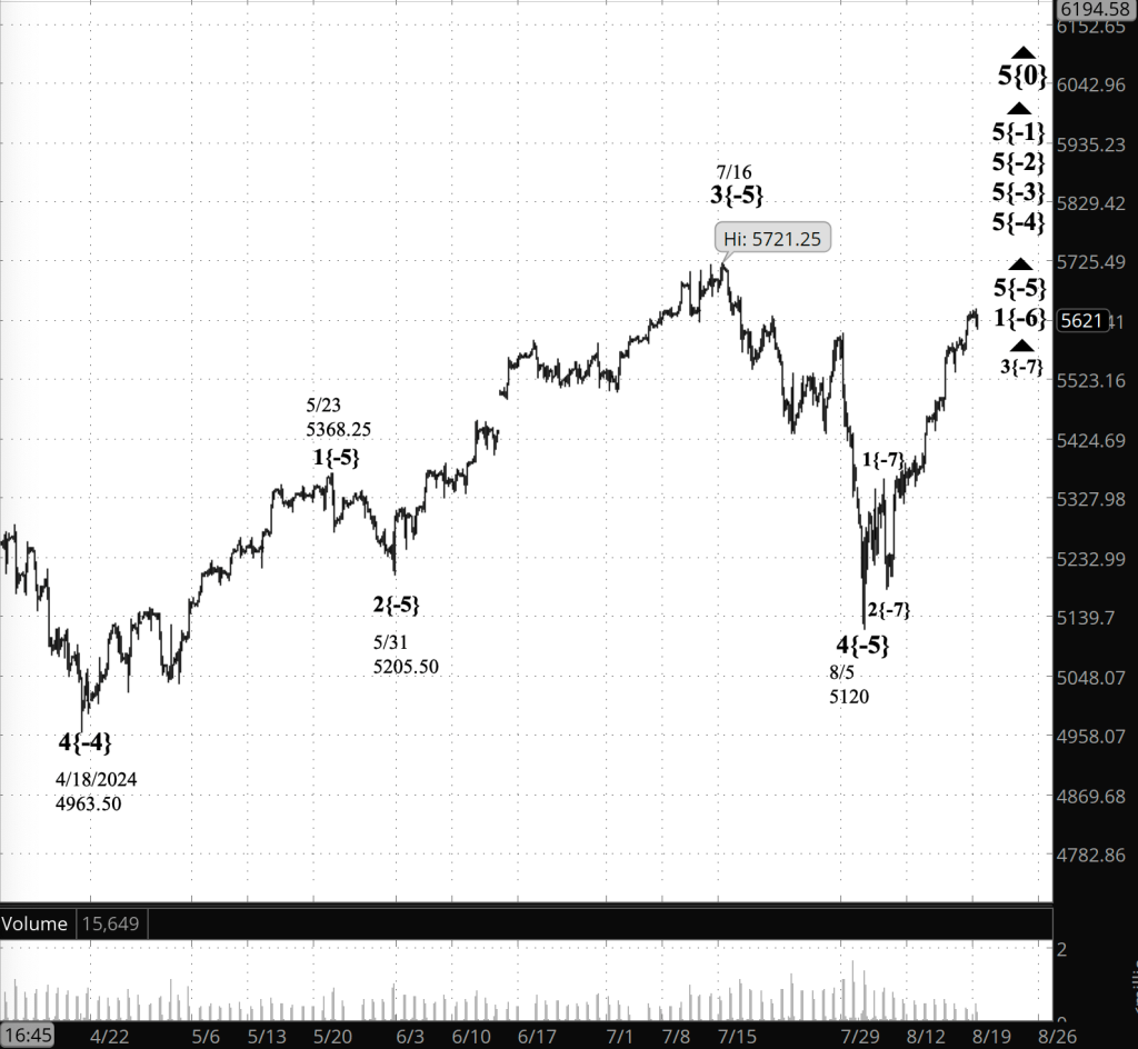I’ve renumbered the chart to show that the present wave is the 3rd subwave — wave 3{-7} — within the larger 1st subwave — wave 1{-6} — within the uptrending 5th wave — wave 5{-5} — that began on August 5.
