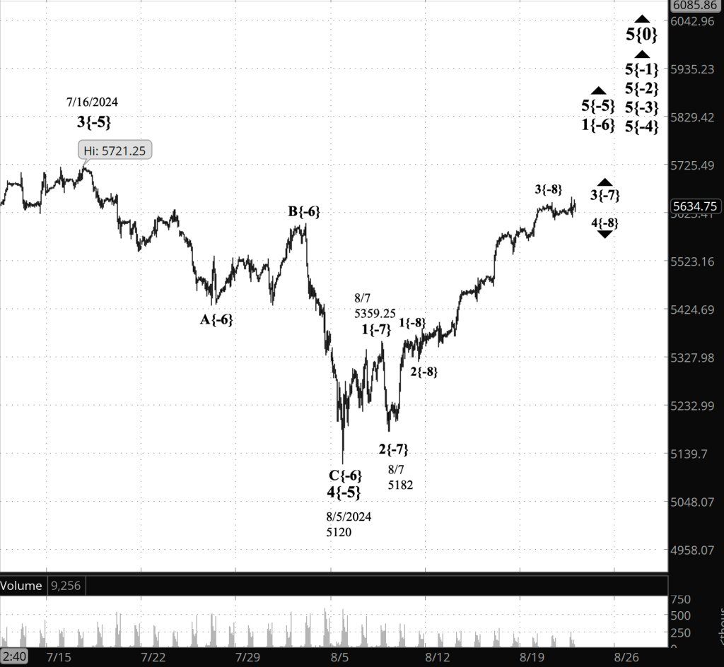 Half an hour before the closing bell. The S&P 500 futures traced a sideways course during the session, whipsawing from the 5620s to the 5660s and back into the 5610s as part of a very small subwave correction. The 5th-wave uptrend that began on August 5 continues to work through its early phase.