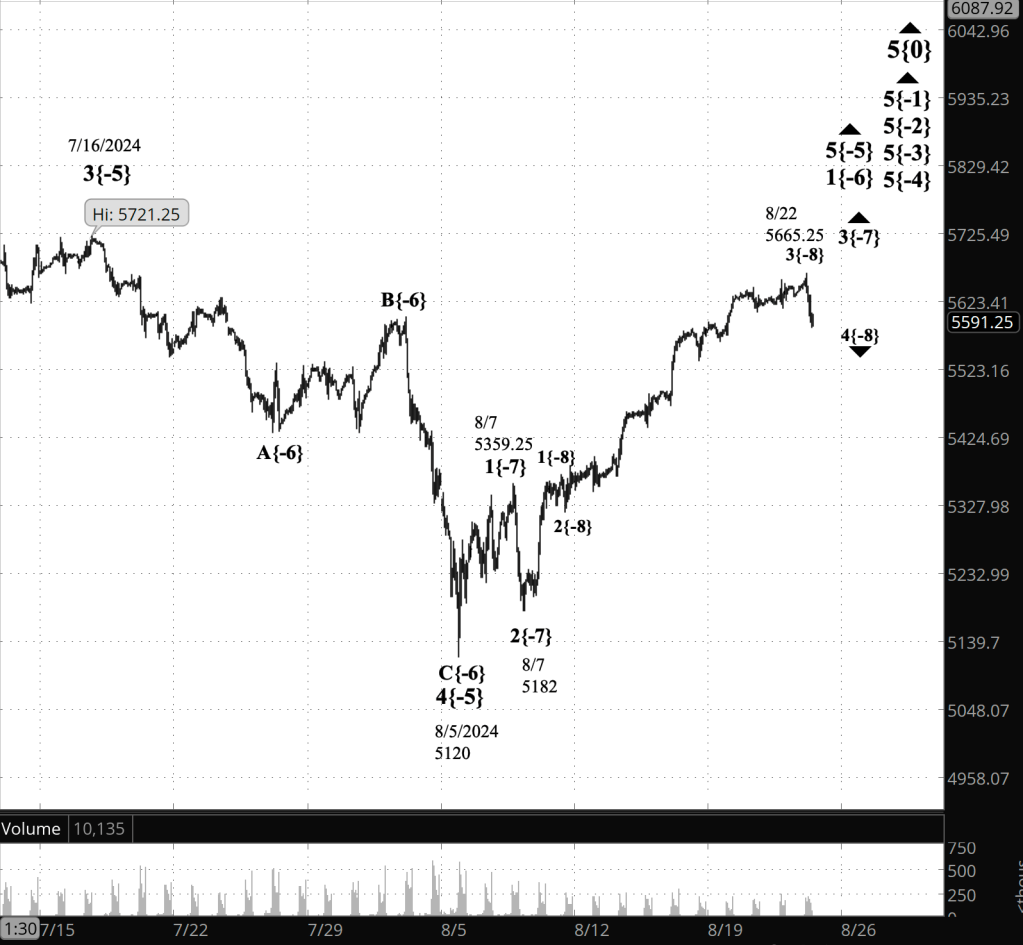 - Wave 5{-5} is in its initial subwave, wave 1{-6}, which in turn is in its middle subwave, wave 3{-7}.