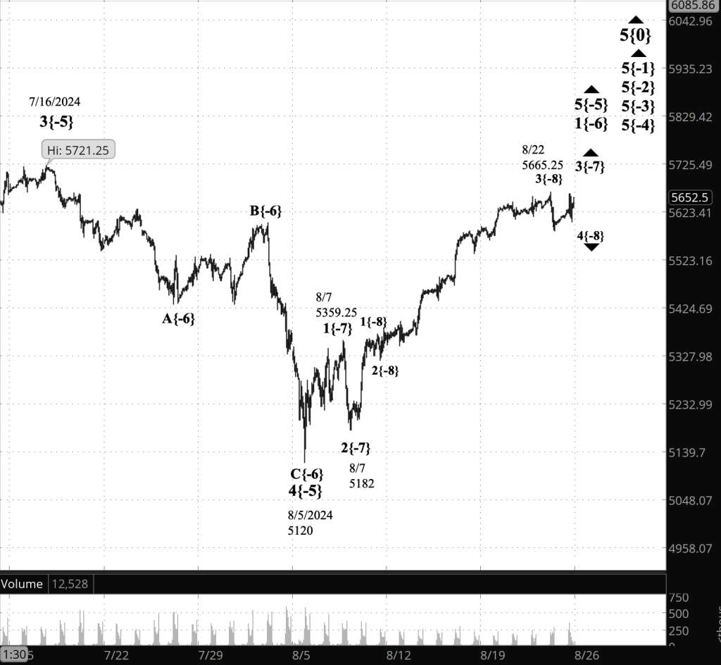 That 5th wave is a subwave of a larger uptrending 3rd wave, which in turn is a subwave of a still larger uptrending 1st wave, the initial subwave of 5th-wave uptrend that began on August 5 and that, if typical, will carry the price above the end of the preceding 3rd wave, 5721.50, and perhaps significantly above that level.