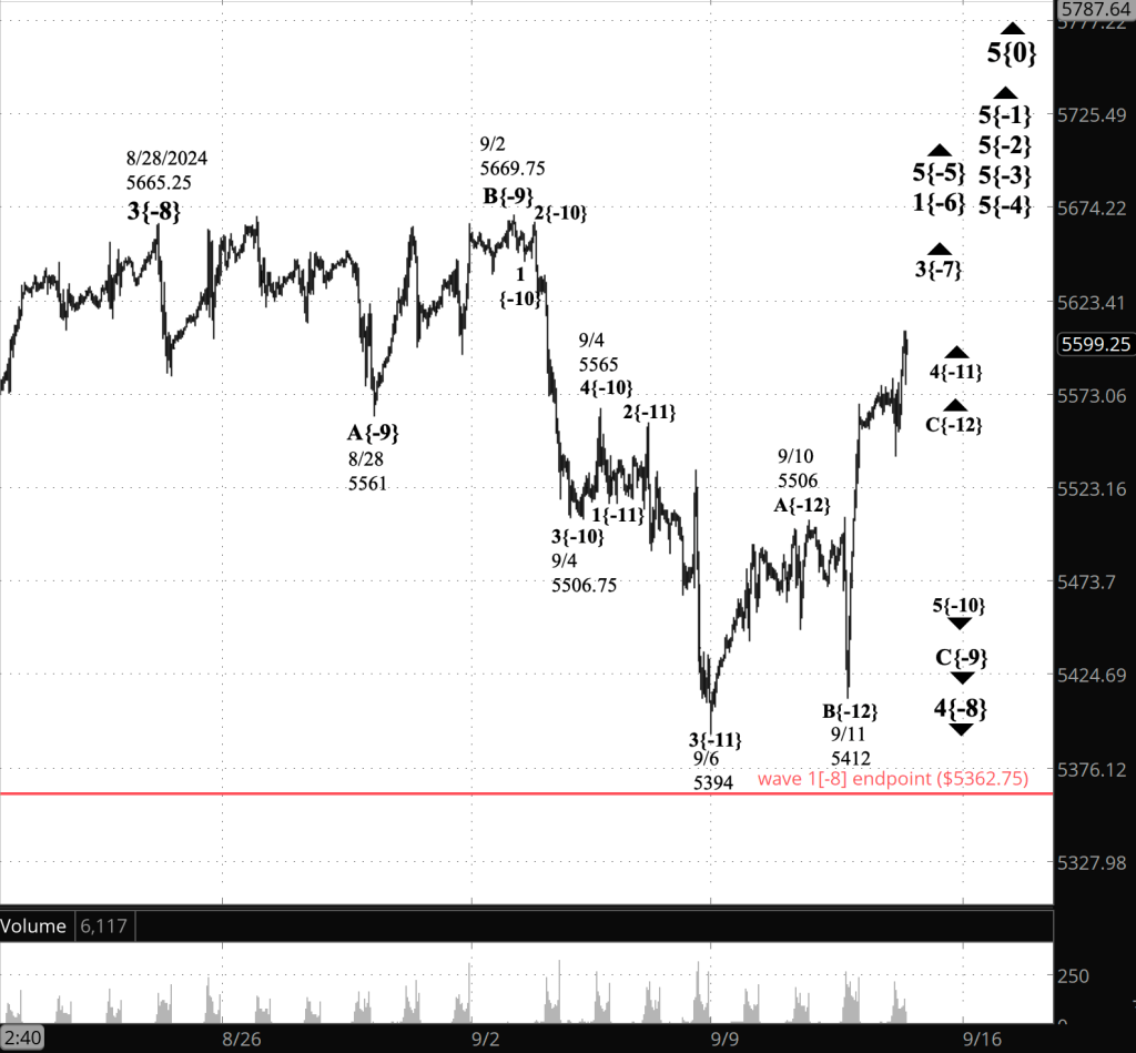 The 4th wave that began on August 28, under the rules of Elliott Wave Theory, cannot move below the endpoint of the preceding 1st wave, which was at 5362.75. I’ve marked that level on the chart with a red horizontal line.