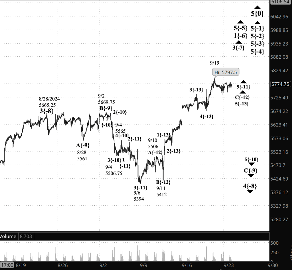 What does it mean? The price remained below the September 19 high, 5797.50. After applying Elliott Wave Theory, I’ve concluded that the decline from that high is very low degree 4th-wave downward correction.