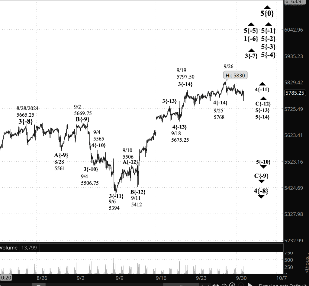 Nothing is a clear at the moment. I’ve decided to label the chart with the 4th-wave endgame scenario until I see a stronger indication that wave 5 has begun. A move below the September 25 low, 5768, would strengthen the argument in favor of that scenario. The lower the price falls, the more likely that senario becomes.