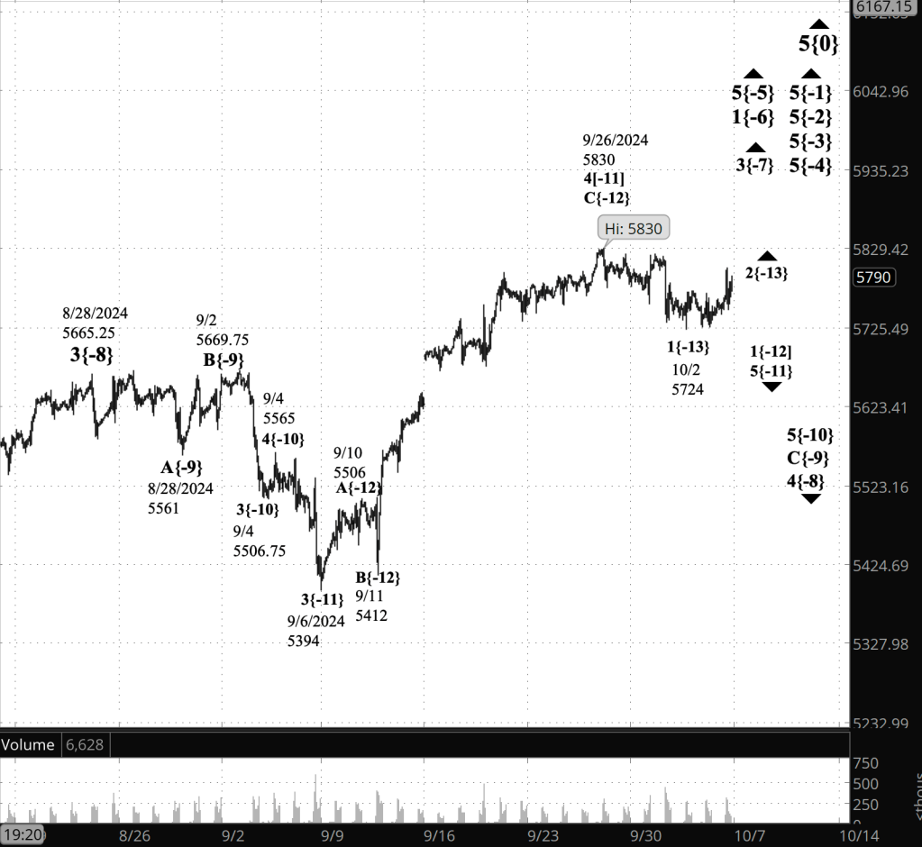 Under the Elliott Wave rules, the rising 2nd wave must remain below the start of the preceding 3rd wave — 5830. If it were to move above that level, then something else is going on and the analysis will be redone.