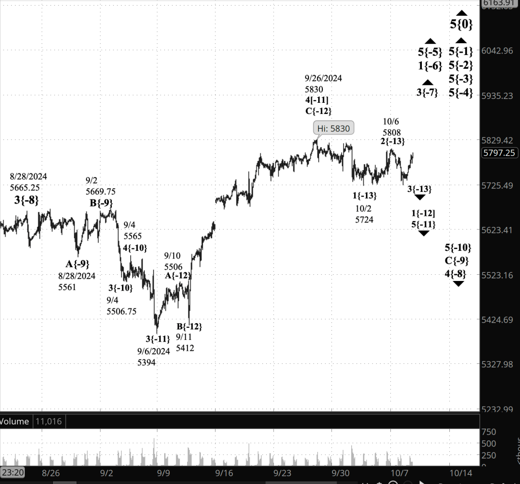 Half an hour before the closing bell. The S&P 500 futures rose during the session, approaching 5800. Elliott Wave Theory: The 5th-wave downtrend that began on September 26 is in its first subwave, which in turn is in its declining 3rd subwave. The present rise is a subwave of the larger declining 3rd wave.