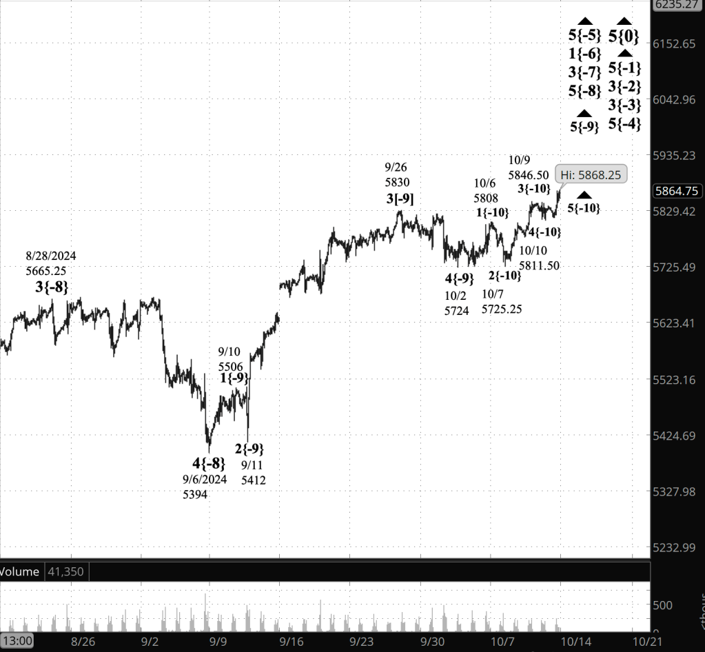 What we can know is that when wave 5{-10} reaches its end, it will also be the end of its parent wave 5{-9}, and its grandparet wave, 5{-8}, the latter having begun on September 9.