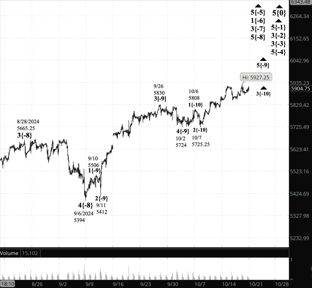 - Wave 5{-8} is in its final subwave, wave 5{-9}, which is in its middle subwave, rising wave 3{-10}.