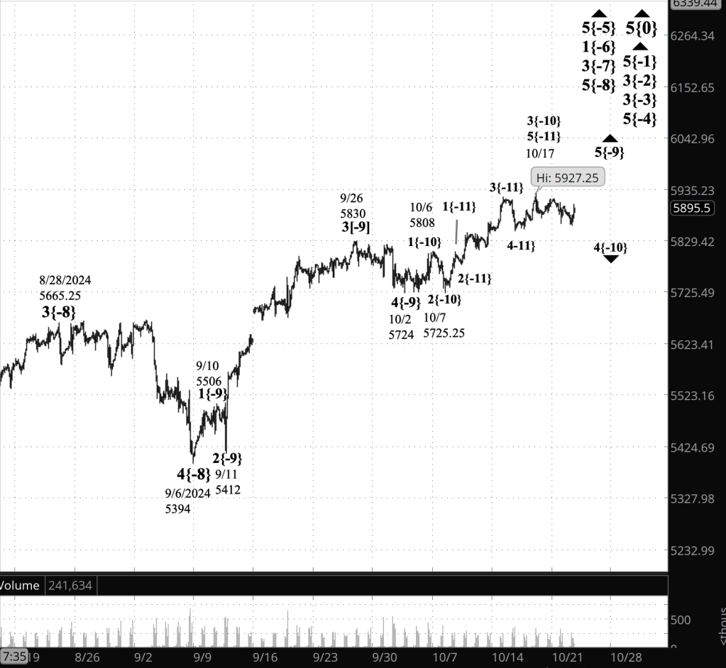 What does it mean? Using Elliott Wave Theory, it’s clear that the decline, which began on October 17 from 5927.25, has traced three subwaves — down, up, down, or waves A, B and C — a typical pattern for a downward correction. Longer-term analysis shows that the correction is a 4th wave.