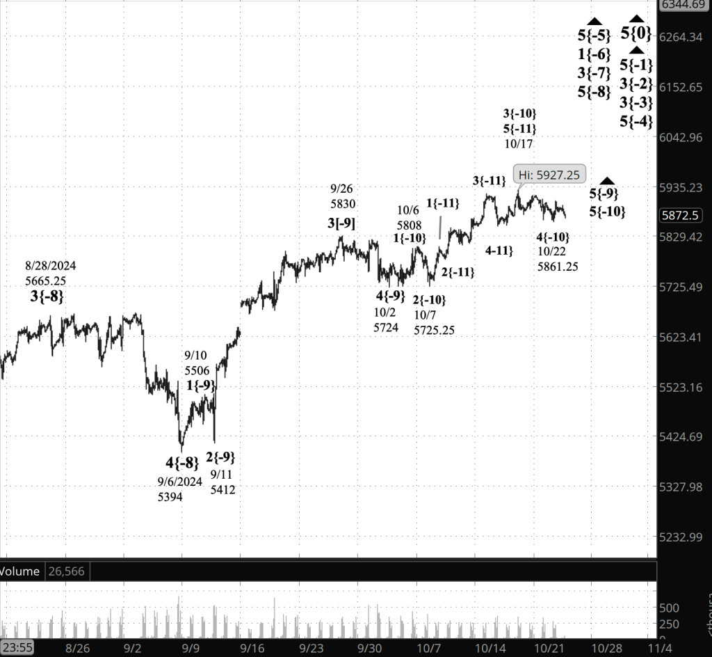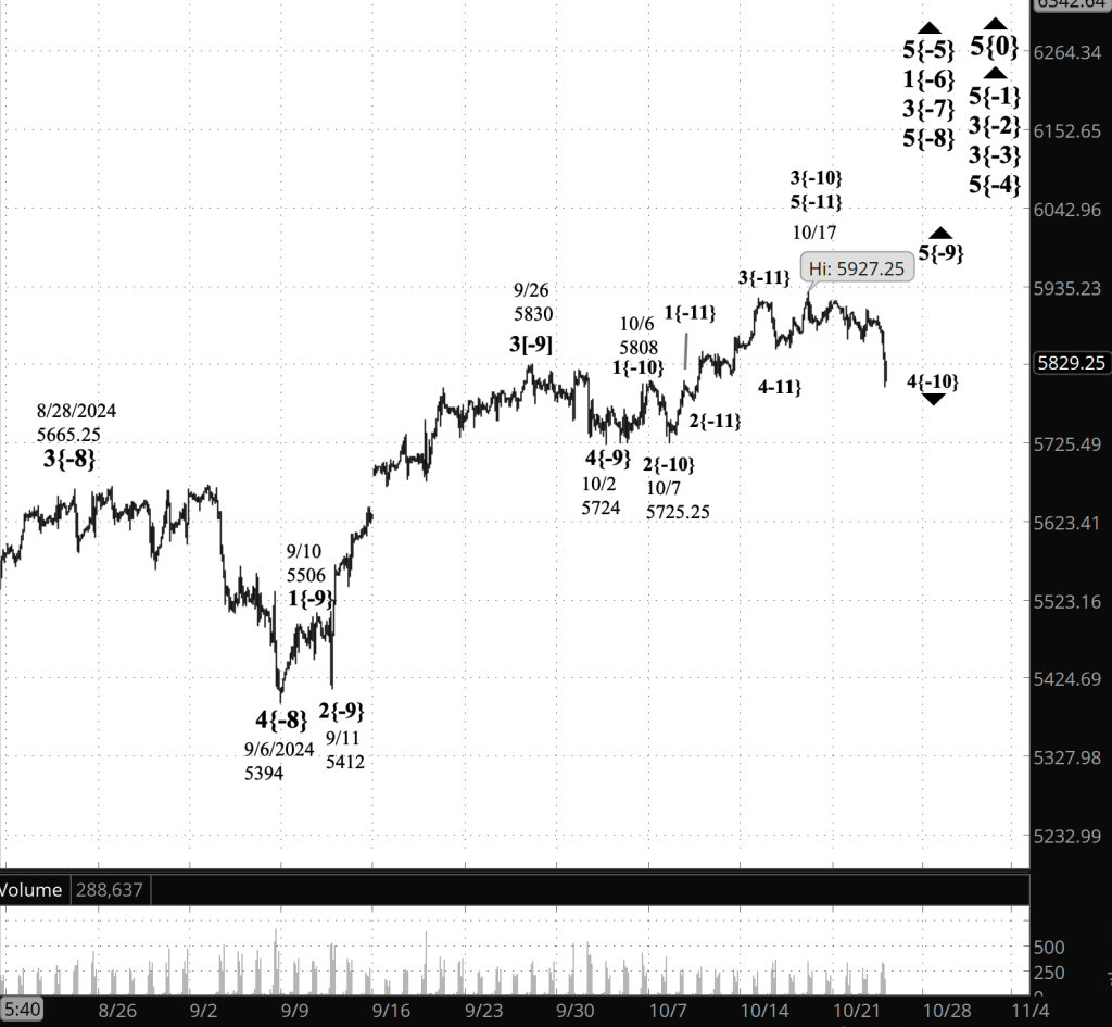 The SP 500 futures fell sharply during the session, coming close to 5800. The 4th-wave downward correction that began on October 17 continues. The wave that will follow, a 5th-wave uptrend, still lies in the future.