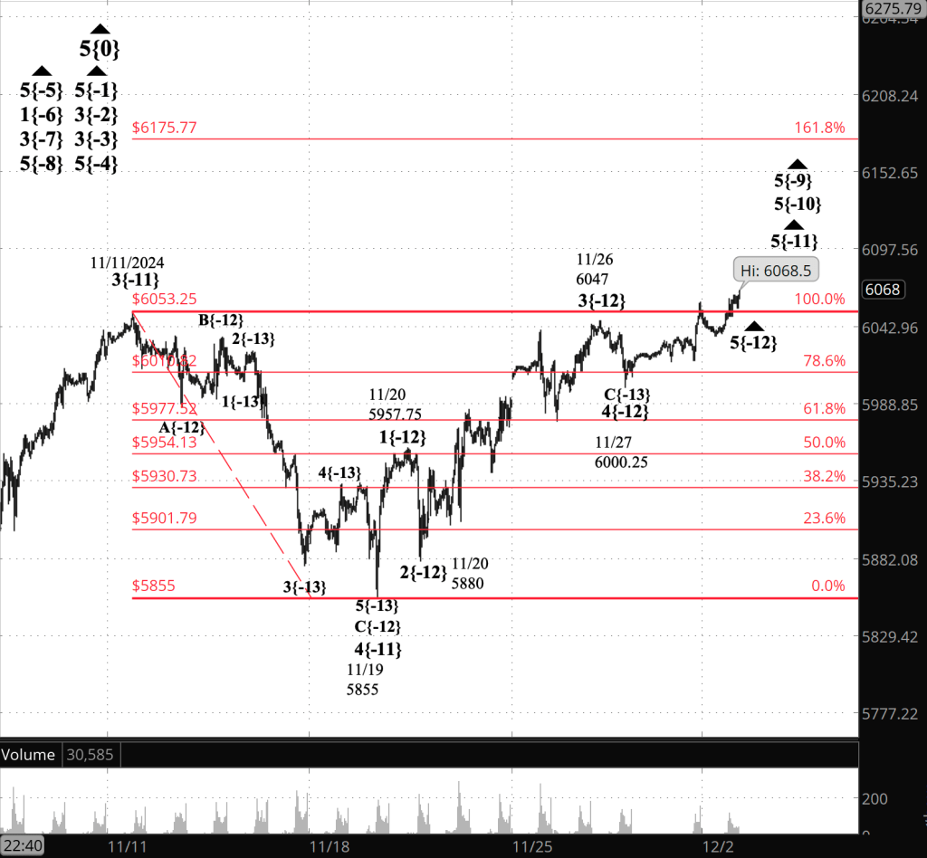 Half an hour before the closing bell. Elliott Wave Theory: The S&P 500 futures reached into the 6060s during the session, as the 5th-wave uptrend that began on November 27 continued its rise.