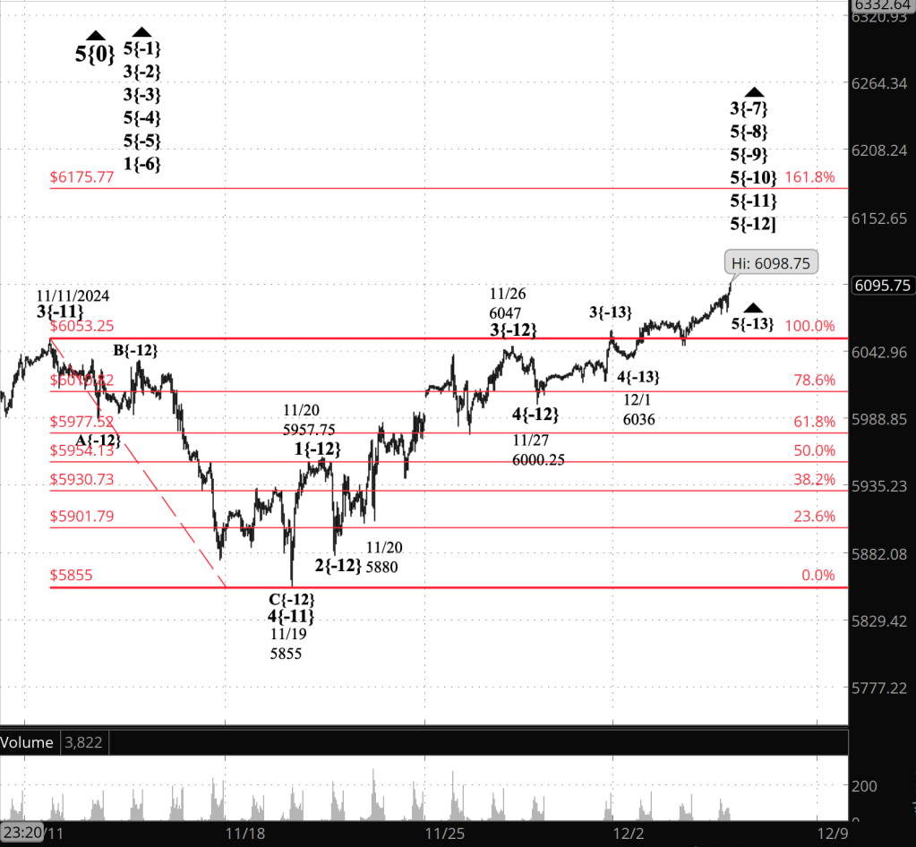 What does it mean? Based on Elliott Wave Theory analysis, I’ve concluded that the uptrending 5th wave that began on November 27 from 6000.25 is now in its 5th and final subwave. That subwave began on December 1 from 6036.