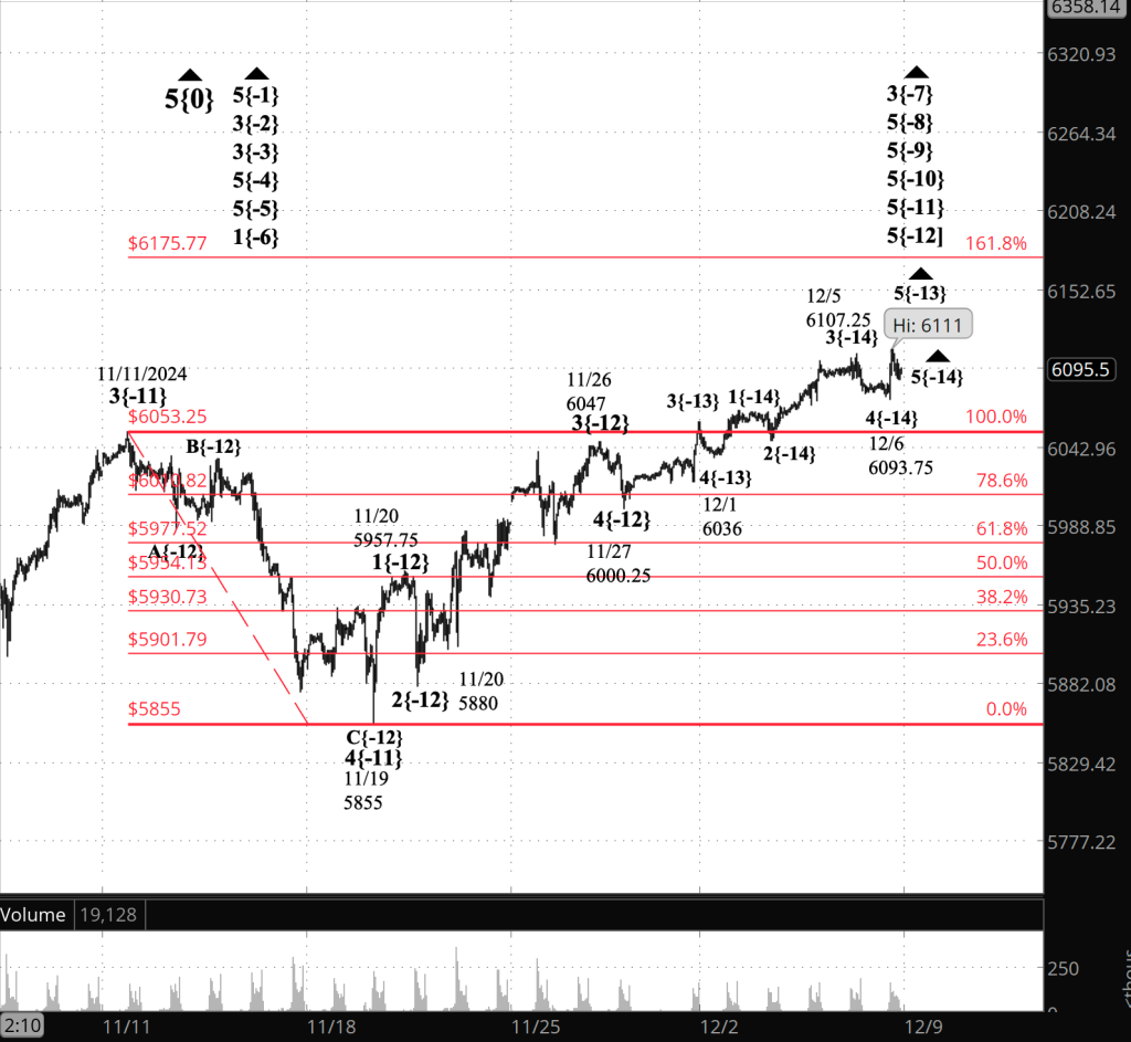What’s happening now? The S&P 500 E-mini futures rose sharply overnight after the Bureau of Labor Statistics published the November unemployment rate, 4.2%, up from 4.1% a month earlier and from 3.7% a year earlier. The price rise carried the price from 6076 to 6100.75. It then fell slightly but remained on the higher side of the range.