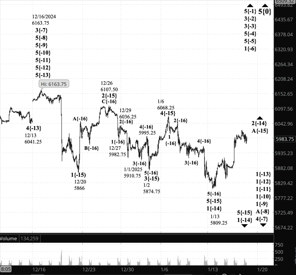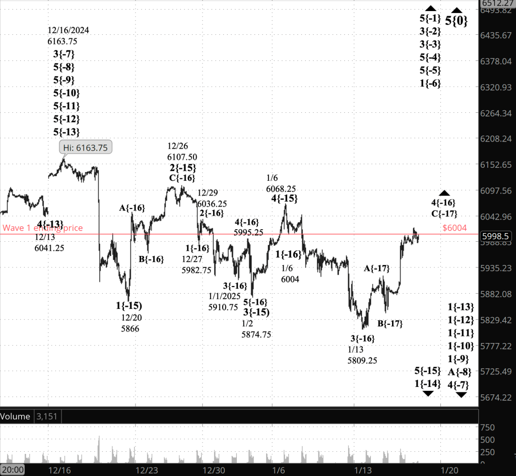 The 4th wave high overnightt, 6017.50, is $13.50 above the end of wave 5’s initial subwave. Wave 1 ended at 6004 on January 6. If a 4th wave moves above the end of the preceding 1st wave of the same degree, it has violated a rule of Elliott Wave Theory.