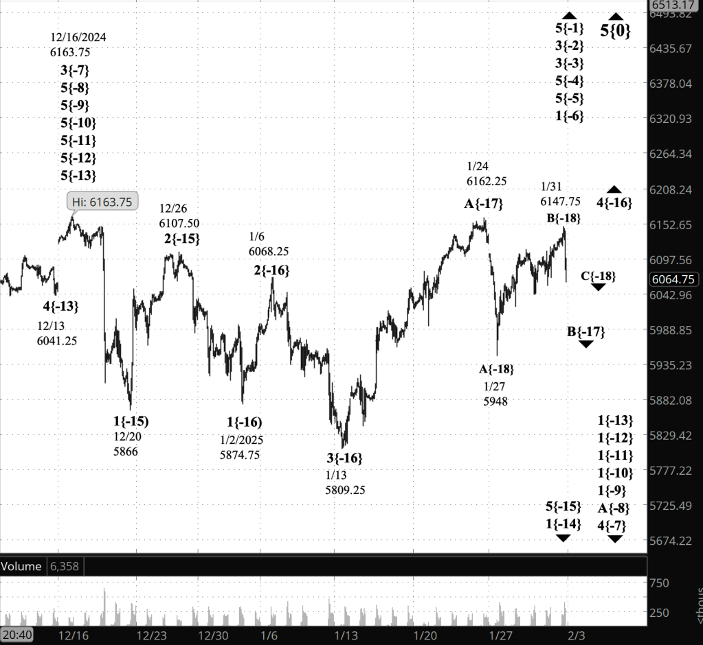 The wave 2{-16} correction, from January 2 to January 6, has three clear subwaves, so based on that, I’m considering wave 4{-16} to be a Flat, meaning that it must reach 6140.75 and can go higher, even beyond the starting point of the preceding A{-18} wave.