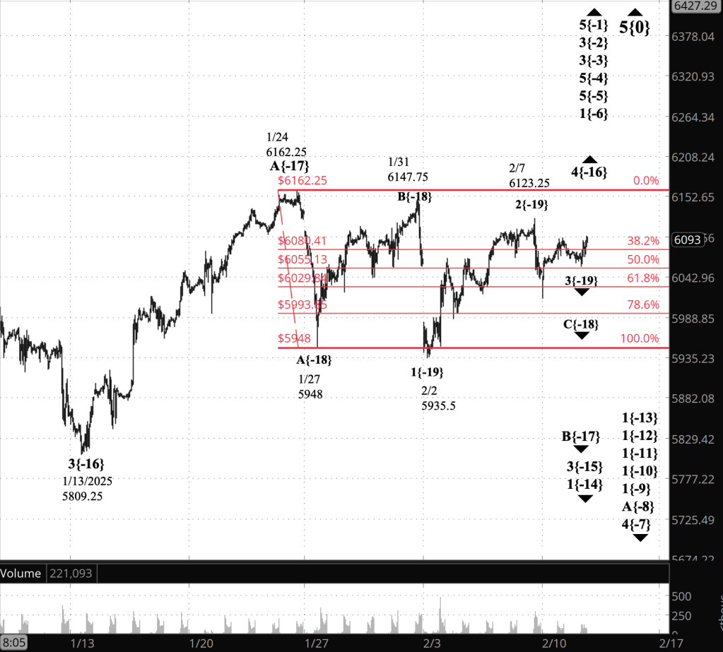 If the price moves above 6123.25, the high of rising wave 2{-19} in the principal analysis, then I would switch to an alternative scenario: Wave B ended on February 2.