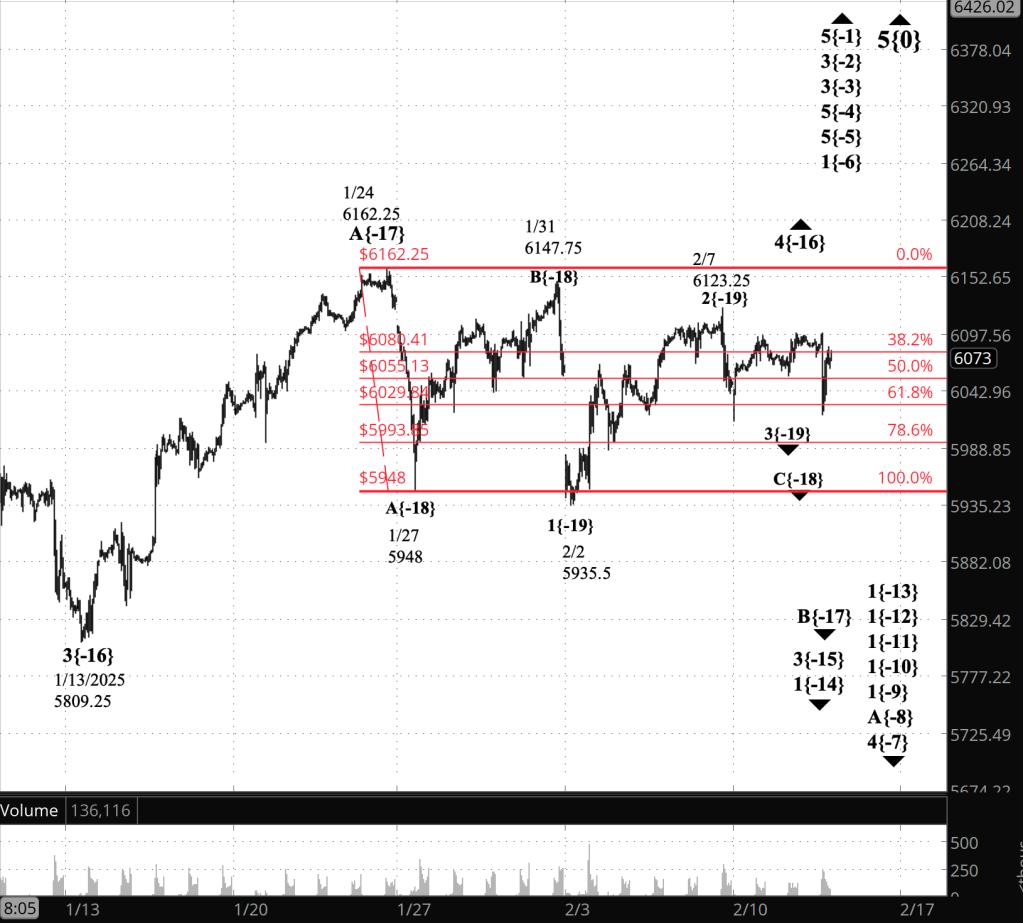 If the price moves above 6123.25, the high of rising wave 2{-19} in the principal analysis, then I would switch to an alternative scenario: Wave B ended on February 2. The price showed a sharp decline today without having moved above 6123.25, so by that criterion a re-analysis hasn’t been triggered.