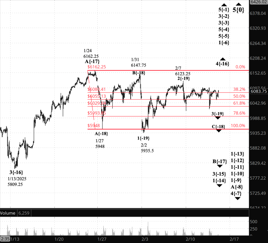 If the price moves above 6123.25, the high of rising wave 2{-19} in the principal analysis, then I would switch to an alternative scenario: Wave B ended on February 2.