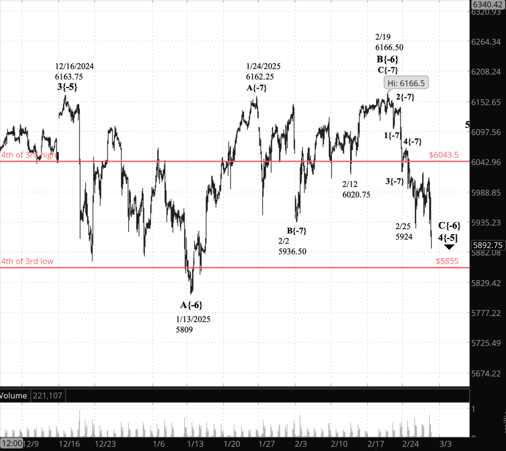 The low point of the present 4th wave has been 5924 so far, placing it within the range of the 4th subwave of prior 3rd wave. Since this 4th wave is within the 4th of 3rd, and since a straightward labeling of the subwave leading to the February 25 low at wave 5, then wave C has ended.