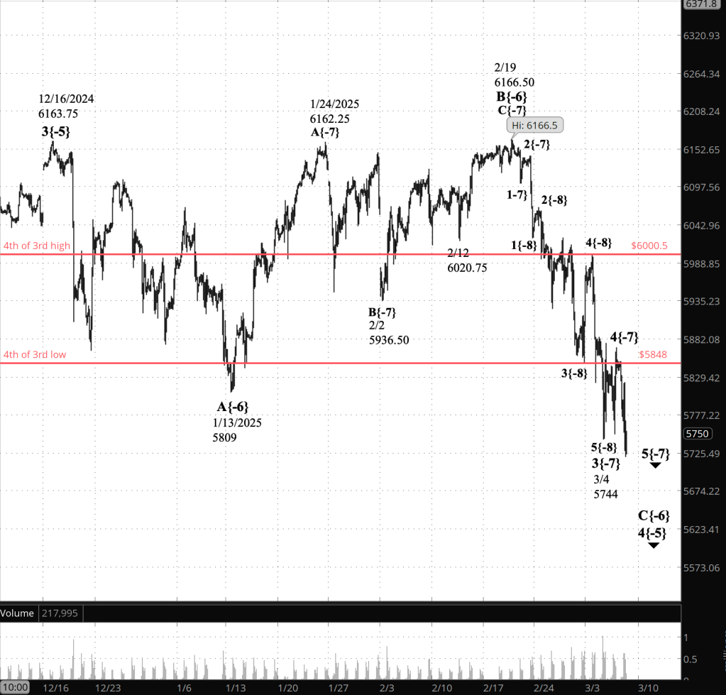 What is the alternative? If the present smaller 4th wave, wave 4{-7}, declines past 5744, then the numbering doesn’t match the chart. The wave would be a subwave of wave of declining wave 3{-7}, which would still be underway.