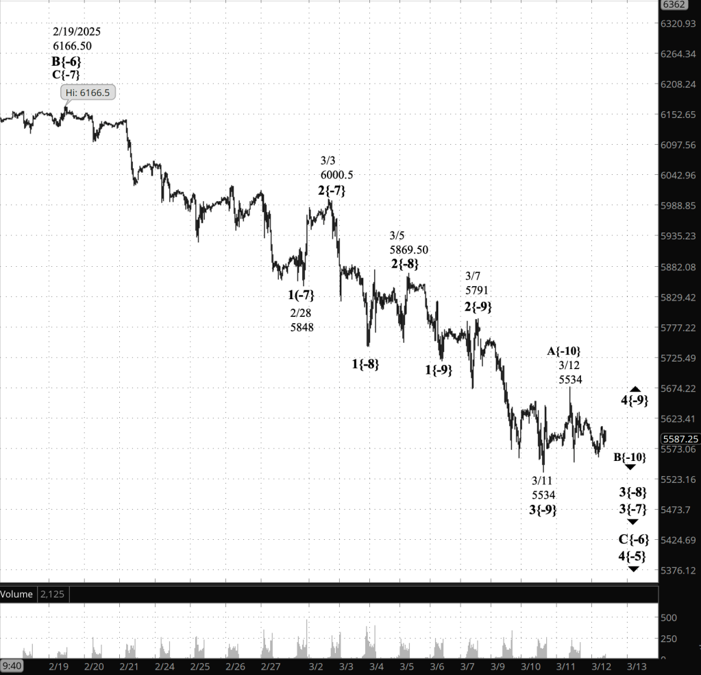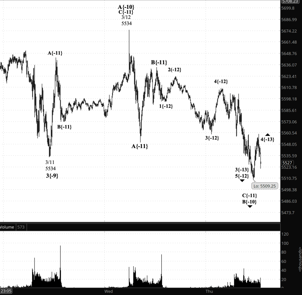 Through the lens of Elliott Wave theory, the pattern can be seen as two subwaves, waves A{-10} and B{-10}, within a 4th-wave rising correction. Wave 3{-9}, the decline that began on March 7, ended on March 11 at 5534.