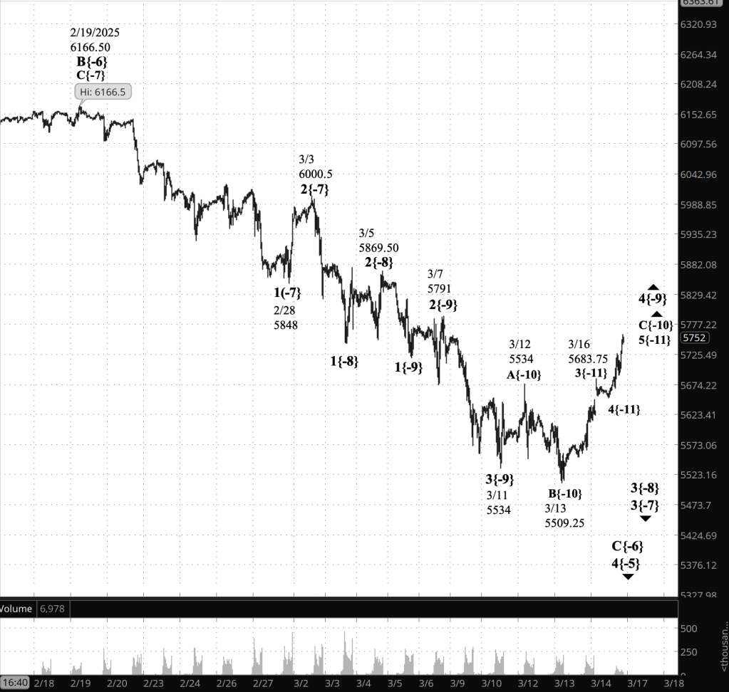Corrective wave 4{-9} and its subwave, C{-10}, continue to rise. I’ve made a change to my understanding of the 4th wave’s internal structure. I had labeled the March 16 turning point, from 5683.75, as the end of wave 3{-12}, a subwave of wave 3{-11}, the middle subwave of wave C{-10}.