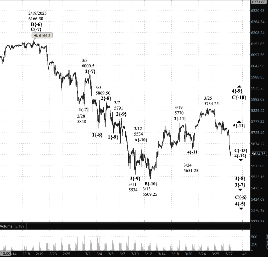 - When wave 4{-9} is complete, downtrending wave 5{-9} will begin, carrying the price back to the 5530s and most likely lower.