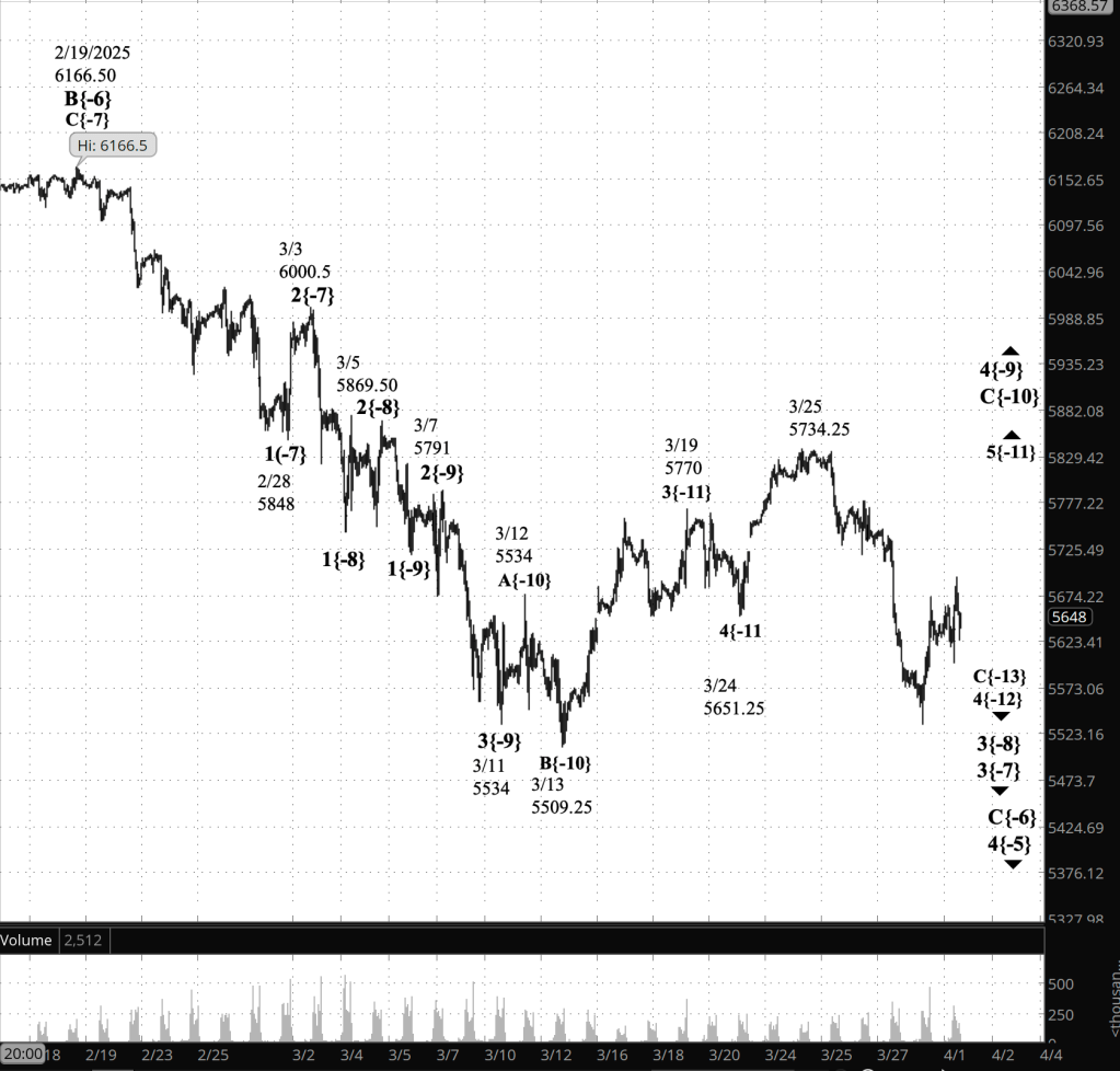 - When wave 4{-9} is complete, downtrending wave 5{-9} will begin, carrying the price back to the 5530s and most likely lower.