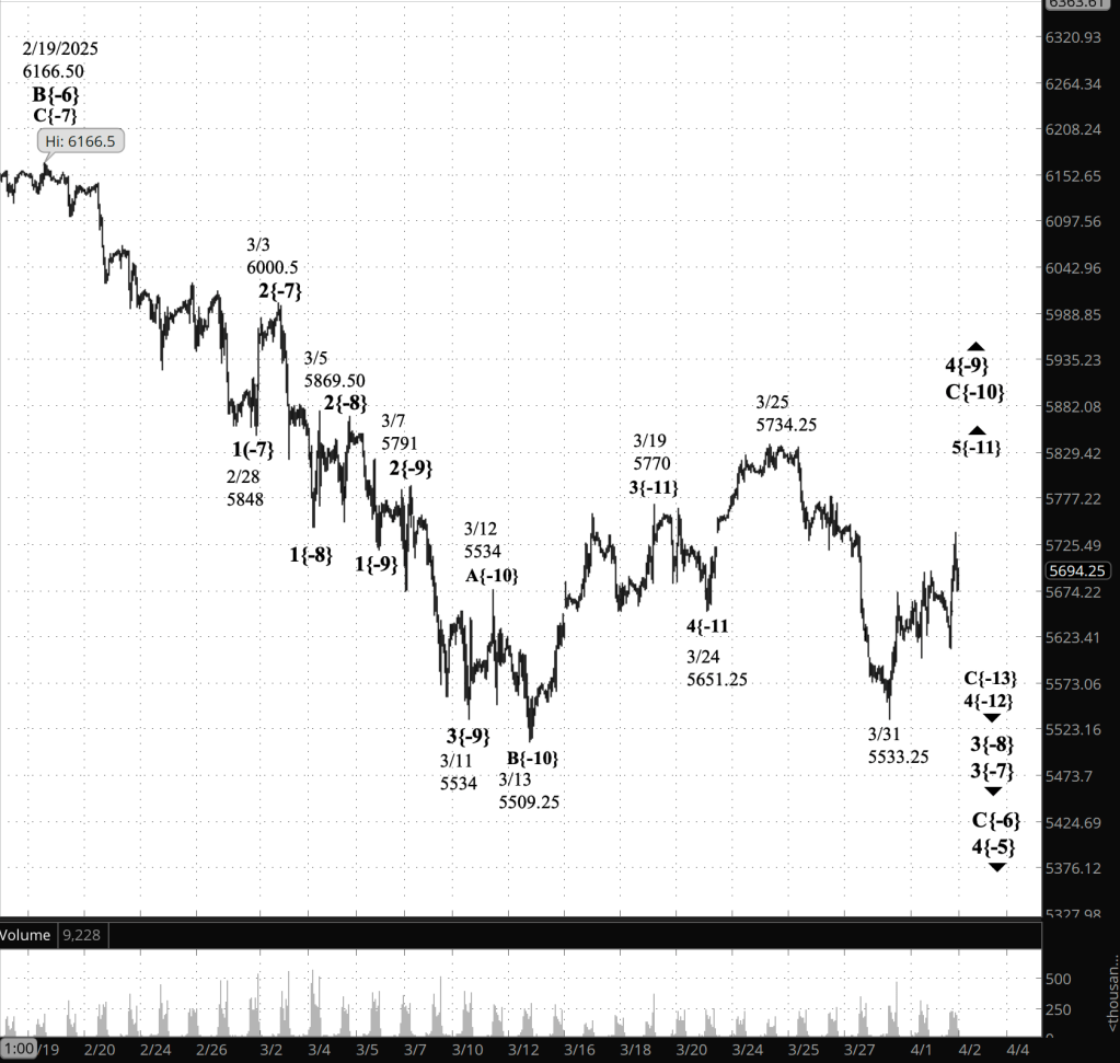Declining Wave C{-6} within declining wave 4{-5} continues, as it has since last February 19. The March 13 low, 5509.25, marked the end of Wave A{-7}. The March 25 high was the end of wave B{-7} and the decline that began on April 2, including the tariff drop, is wave C{-7} and is still underway. I count today’s decline as being wave 3{-8} within the parent C wave.