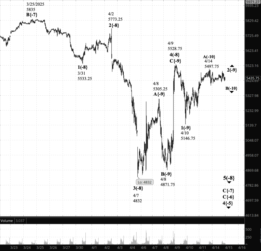What’s happening now. The S&P 500 E-mini futures continued to work their way downward from the April 14 peak, 5497.75, reaching the 5410s as the open bell approached.