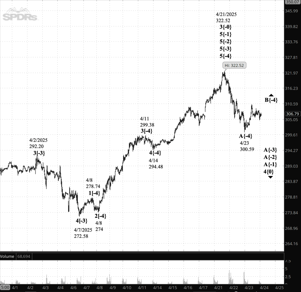 What does it mean? The pattern seem through the lens of Elliott Wave Theory is compatible with wave A ending on April 23, two days after the Apri 21 peak put an end to a number of rising impulse waves. Under this, my principle analysis, rising wave B is underway.