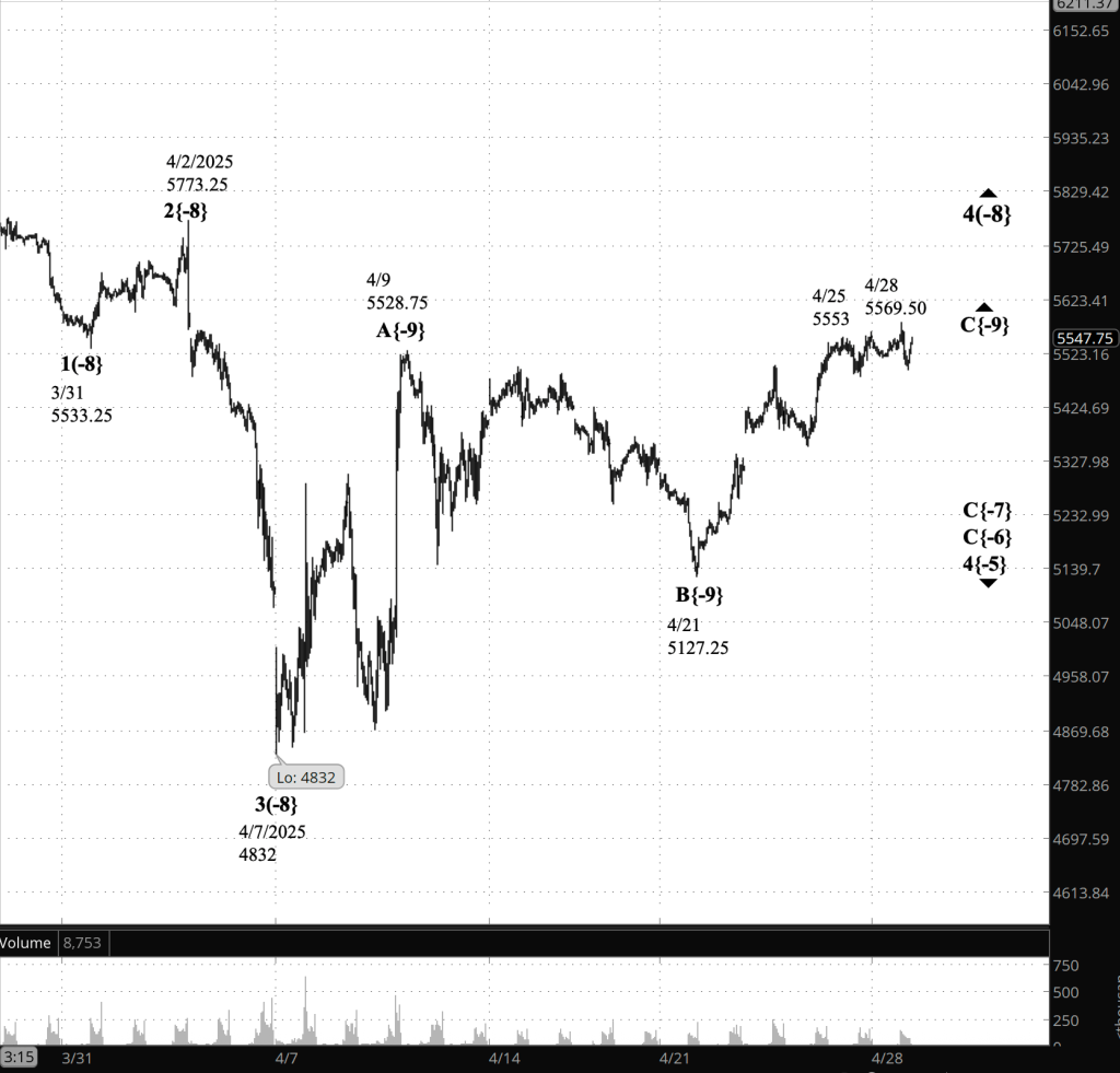 Half an hour before the closing bell. The S&P 500 futures continued meandering between the 5560s and the 5540s in a correction, Elliott Wave Theory says, within rising wave C, the final subwave of the 4th-wave upward correction that began on April 7 from 4832. The waves involved are labeled wave C{-9} within wave 4{-8}.