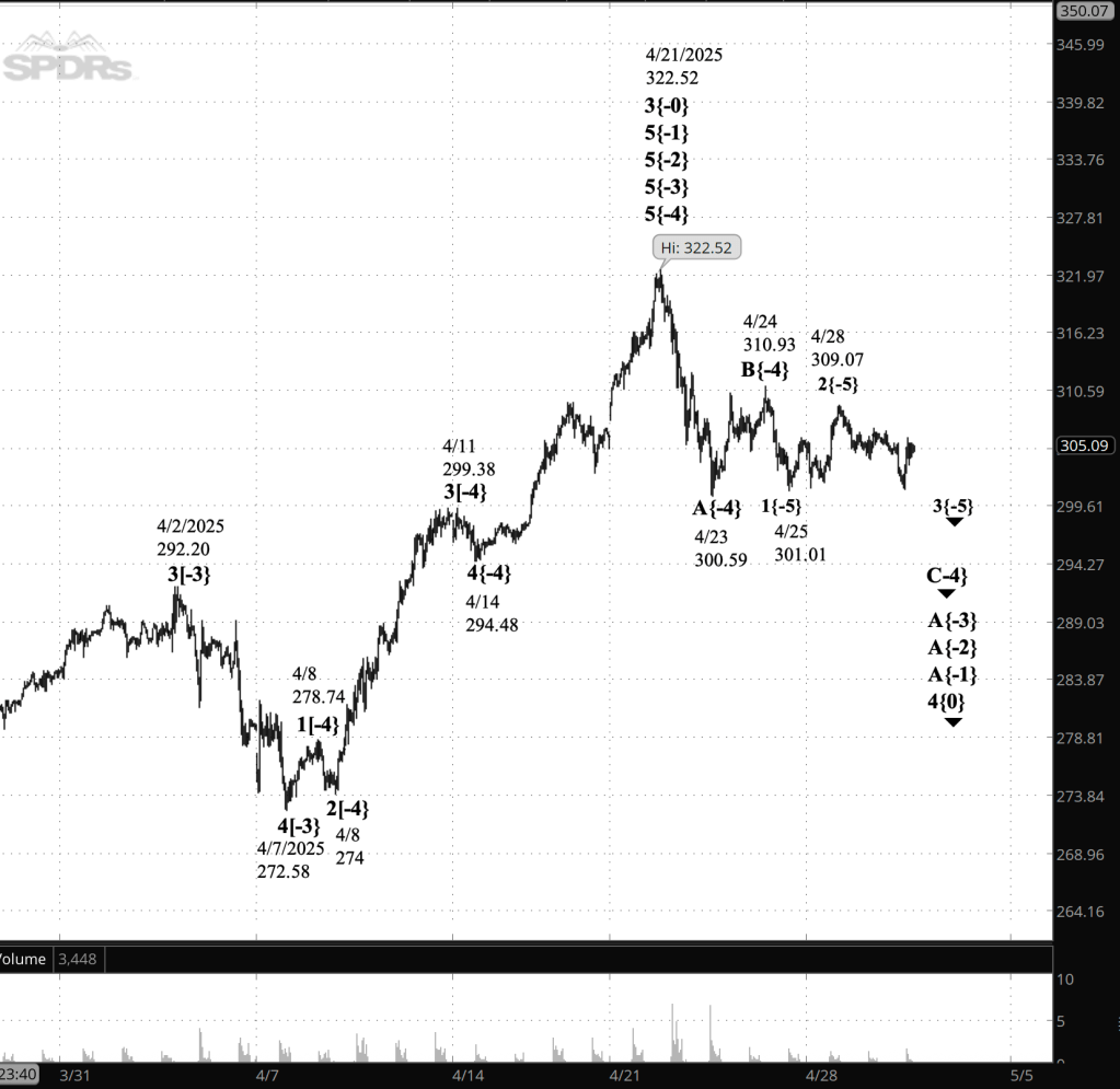 Declining wave C{-4} paused for a small upward correction before continuing its decline. ended on April 24 at 310.93 and declining wave C{-4} began and is underway. C4 is a subwave of declining wave A{-3}.