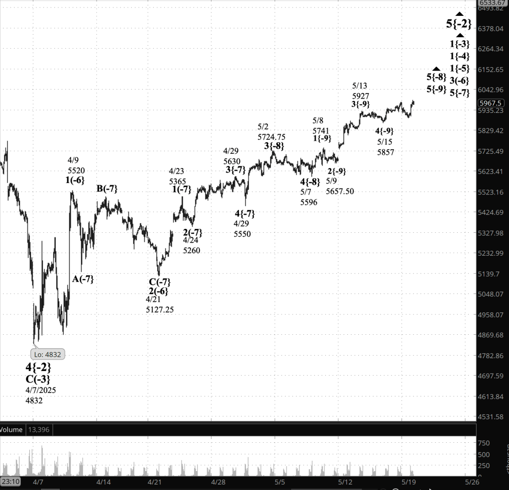 Half an hour before the closing bell. The S&P 500 futures rose during the session, reaching the 5980s as the closing bell approached. Elliott Wave Theory: The uptrending 5th wave that began on May 15 continues and is in its early subwaves.
