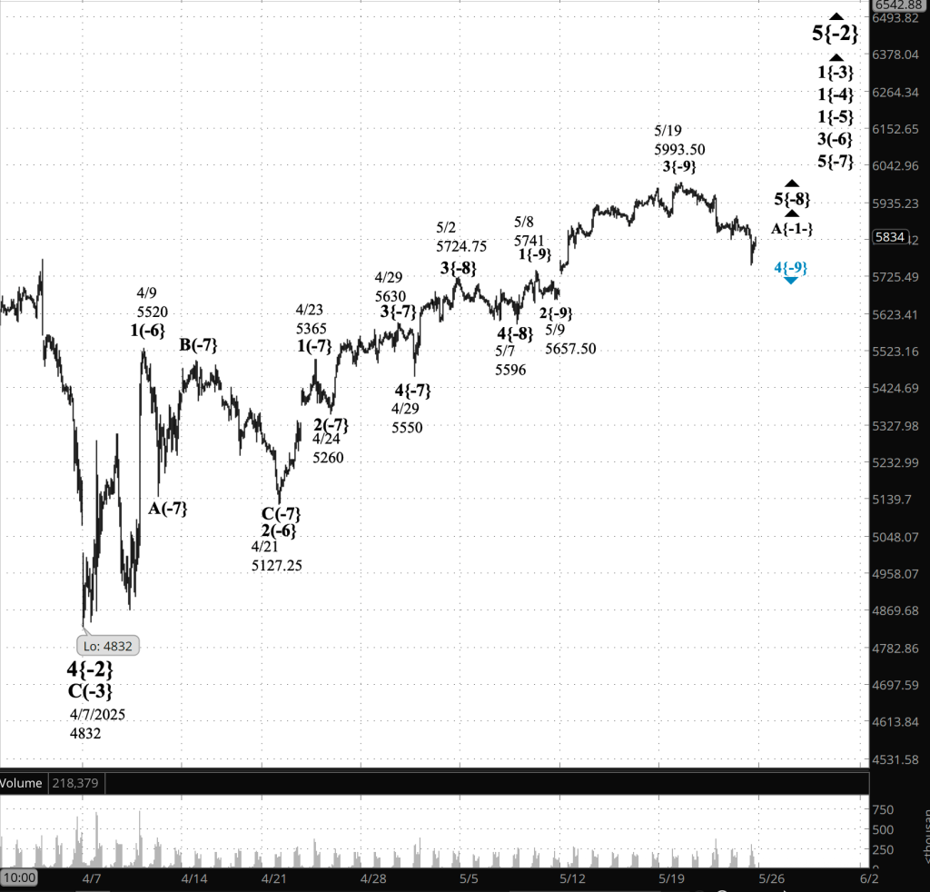 However, the overnight decline has brought the 4th wave perilously close to violating a rule of Elliott wave theory: A 4th wave can’t cross the end of the preceding 1st wave. Wave 1 ended on May 8 at 5741. Wave 4, as noted above, has reached a low ovrnight of 5756.50.
