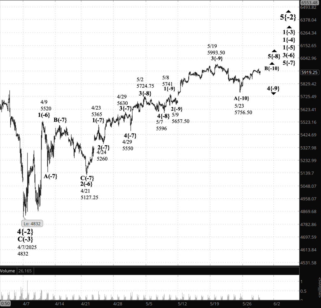 Within wave 5{-7}, uptrending wave 5{-8} is in its next-to-the-last stage, a downward correction, wave 4{-9}.
