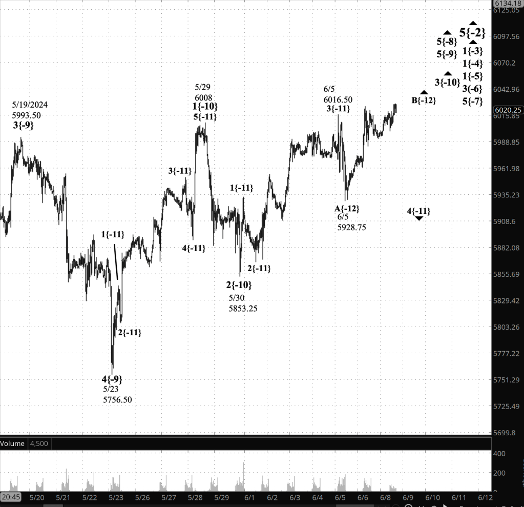 Within wave 5{-9}, its middle subwave, wave 3{-10}, is underway. Internally, wave 3{-10} is in its 4th subwave, wave 4{-11}, a downward correction that began from 6016.50.
