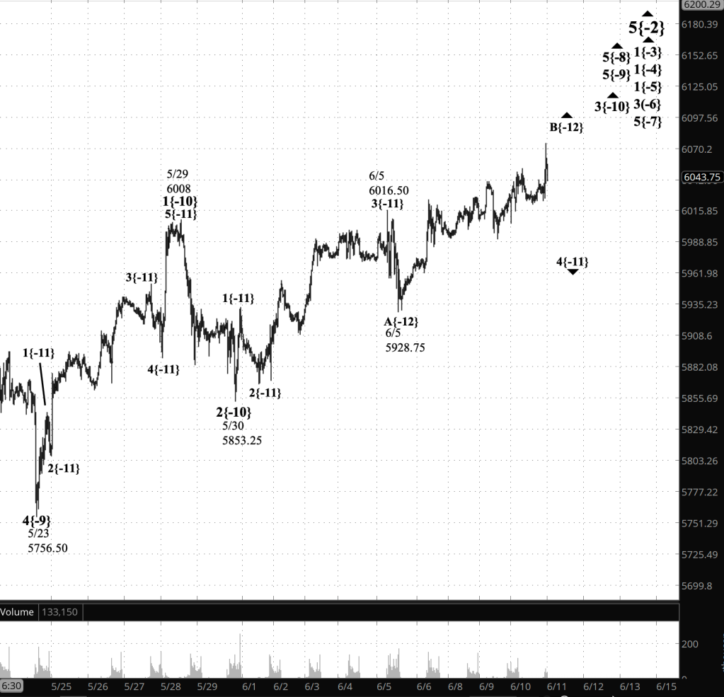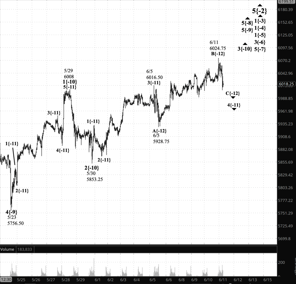 Within wave 5{-9}, its middle subwave, wave 3{-10}, is underway. Internally, wave 3{-10} is in its 4th subwave, wave 4{-11}, a downward correction that began from 6016.50.