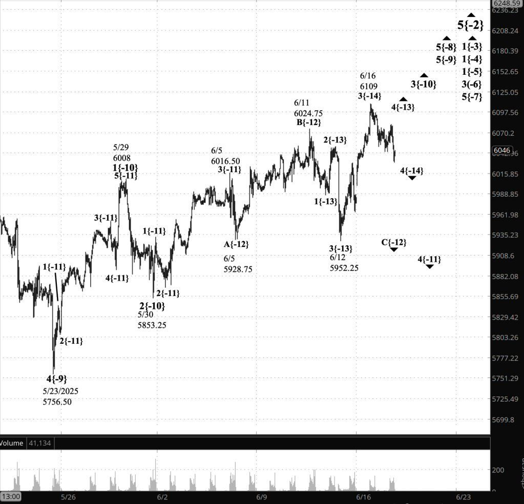 Within wave 5{-9}, its middle subwave, wave 3{-10}, is underway. Internally, wave 3{-10} is in its next to the last subwave, wave 4{-11}, a downward correction that began from 6016.50.