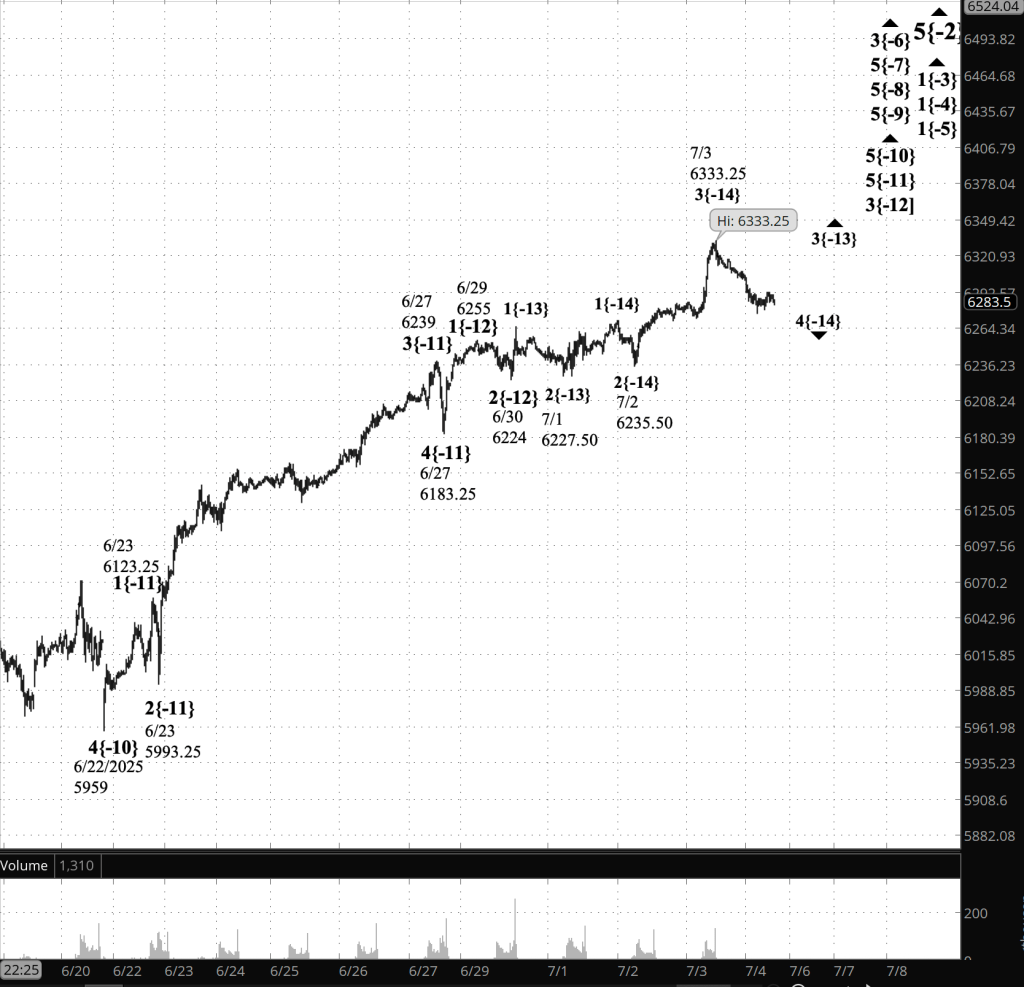 The subsequent decline is wave 4, a downward correction, that when the holiday session ended had reached a low of 6285.50. There is no notable pattern of subwaves within the decline. The simplest interpretation is that the July 4 low marks the end of wave A within the correction, and the slight bounce upward is the start of wave B, the middle wave within the most common 3-wave form of a correction.