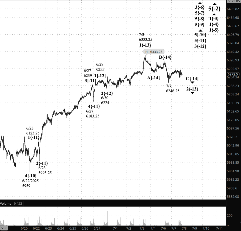 What does it mean? The Elliott Wave Theory analysis depends upon how we interpret the July 7 low, 6246.25. We know that a 2nd-wave downward correction has been uderway since July 3. We know that subwaves falling wave A and rising wave B are complete. We know that the July 7 low has been followed by a fairly lackluster rise.