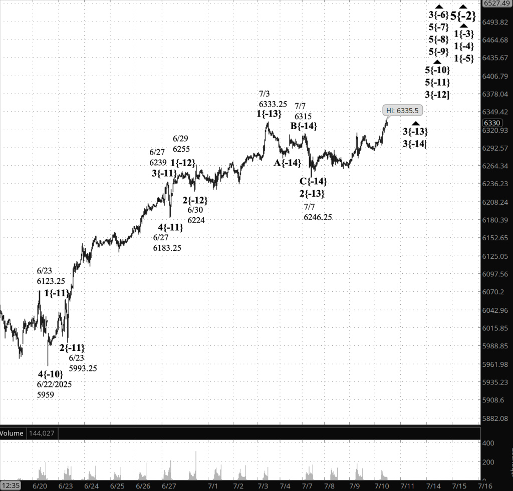 The new principal analysis: Wave C{-14} ended on July 7 and in doing so also brought wave 2{-13} to an end, at 6246.25. From that point wave 3{-13} began and is in its middle subwave, wave 3{-14}. All of tis is contained with the parent wave 3{-12} and grandparent wave 5{-11}, which began June 27.