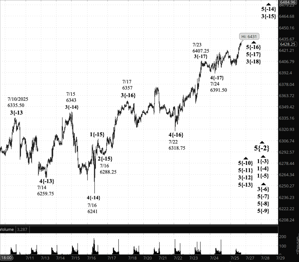 However, it’s messy. The advance from 6391.50 lacks the strong, impulsive character typically expected of a 5th wave. The current movement is overlapping and sluggish, raising the possibility that wave 5{-17} could form as a diagonal or other complex structure. A drop below 6391.50 would invalidate this early 5th-wave interpretation.
